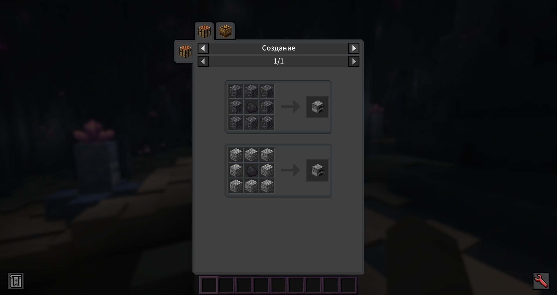 Теперь, вскопав Буром Древнюю породу, Вы окажитесь в Перевёрнутом мире. Здесь уже можно разгуляться и позволить себе для начала хотя бы Каменные инструменты. Учтите, что и тут не обошлось без скользких лапок разработчиков. Для создания этого снаряжения нужен переплавленный вид любого булыжника. А для плавки Вам понадобится печь, создаваемая с углëм в середине сетки крафта.
